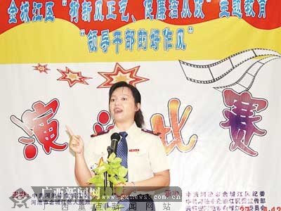 6月27日,河池金城江区举办了以“树新风正气,促廉洁从政”为主题的领导干部好作风演讲比赛,26名选手激烈角逐,该区各单位、部门约200人到现场接受了教育。广西新闻网-广西日报 通讯员 彭连华 莫永兴 摄